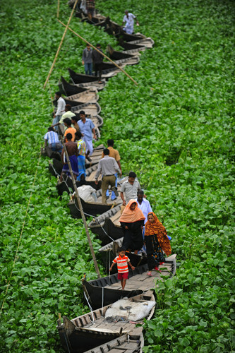 "Commuters walked across a floating boat bridge on the Buriganga River in Dhaka, Bangladesh, Tuesday."