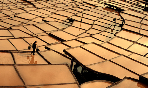 "A villager worked in a salt field in Markham County, Tibet, Saturday. Thousands of salt fields dot the area."