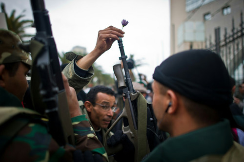 "A protester placed a flower in the barrel of a gun during a demonstration outside the headquarters of ousted Tunisian President Zine al-Abedine Ben Ali’s Constitutional Democratic Rally Party in Tunis, Tunisia, Thursday. Tunisian officials are probing Mr. Ben Ali’s finances".