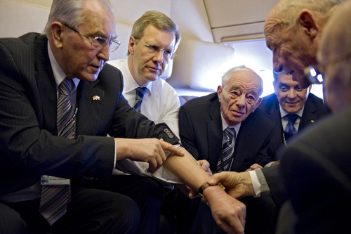 "German O Presidente Alemão Christian Wulff, segundo a contar da esquerda, viajou com sobreviventes de Auschwitz até ao antigo campo de concentração na Quinta-feira em Oswiecim, Polónia, para participar numa cerimónia assinalando o aniversário da libertação do campo de extermínio da Segunda Grande Guerra Mundial".