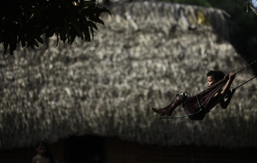 "A boy of the Kayapo tribe played in front of his house in the Kikretum community in Sao Felix, northern Brazil, Friday, where the “Expedicionarios da Saude” organization was setting up a mobile hospital. Twice a year, the group works with volunteer doctors to provide clinical and surgical treatment for indigenous tribes and residents of the Amazonian Rainforest."