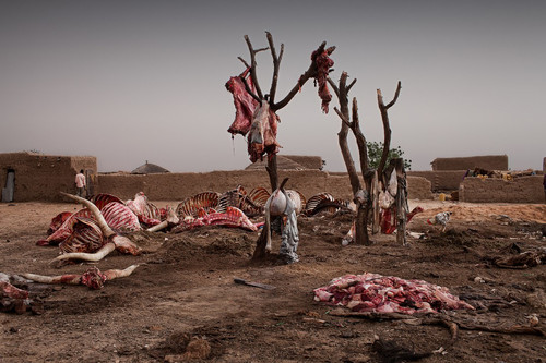 Las entrañas y los esqueletos de ganado muerto se hallan esparcidos por la reserva de Gadabedji en la región de Níger, en África occidental. Algunos comerciantes de carne compran el ganado moribundo, sacrifican a los animales, preparan la carne en el mismo lugar y la venden al país vecino, Nigeria. La peor sequía en Níger desde 1984 dejó hambrientas a las manadas de los ganaderos. La reserva de Gadabedji es una de las últimas zonas de pasto del país. Junto con una cosecha perdida en 2009, la sequía condujo a una crisis alimentaria en Níger, con Maradi como una de las regiones más azotadas. A mediados de 2010, una inspección del Programa Mundial de Alimentos (WPF) estimó que 2,5 millones de niños en Níger necesitaban ayuda humanitaria. Al carecer de sistemas de refrigeración para almacenar ellos mismos la carne, los ganaderos locales no tuvieron otra opción que vender sus animales moribundos por una pequeña parte de la tarifa normal y utilizar el dinero para comprar todos los alimentos que pudieron.