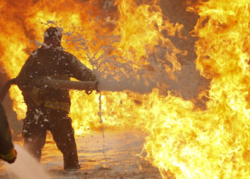 FIGHTING FIRE: A firefighter doused a burning fuel tanker in Kabul, Afghanistan, Monday. The cause of the blaze was unknown and police were investigating. Omar Sobhani (Reuters)