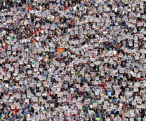 FOR MOROSINI: Supporters of the Udinese soccer team held up signs bearing the jersey number of the late player Piermario Morosini before the team’s Italian Serie A football match against Inter Milan Wednesday at Friuli Stadium in Udine, Italy. (AFP/Getty Images)