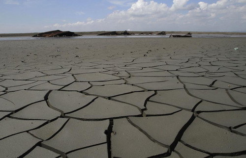 "Cracked mud covered the ground in Sidoarjo, Indonesia, Monday. The mudflow, which started in 2006 after a blowout form a natural gas well, has destroyed hundreds of homes and swamped land, displacing thousands of people. Villagers are rallying for government compensation."