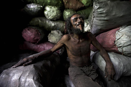 "Sergio, who works carrying coal bags in a market, smoked a cigar during a break at the Israel Lewites market in Managua, Nicaragua, Tuesday."