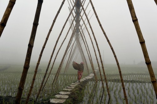 "A woman carried a basket through Friday’s cold and foggy dawn along the banks of the Turag River near Dhaka, Bangladesh."