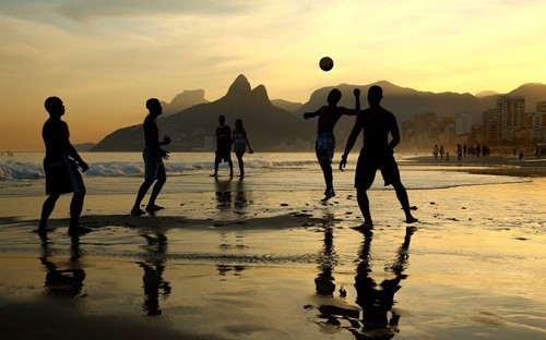 "Young men play beach football as the sun sets on Ipanema beach in Rio de Janeiro, Brazil"