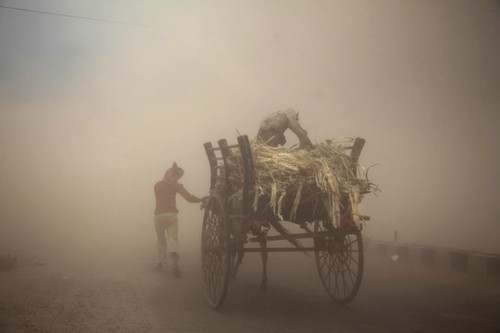 "Two men with a horse cart try to make their way during a powerful dust storm in Jammu, India"