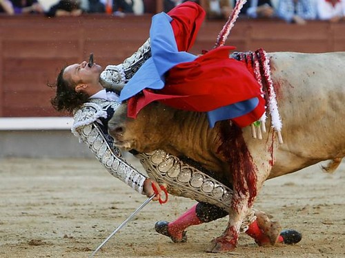"Matador Julio Aparicio is gored by a bull after losing his footing during a bullfight in Madrid. One of the animal’s horns pierced his throat and punched through the bottom of his mouth, puncturing his tongue and fracturing his jaw.