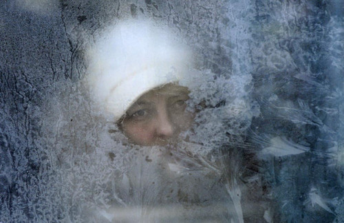 "A woman looked through an ice-covered window on a bus in Kiev, Ukraine, Thursday."