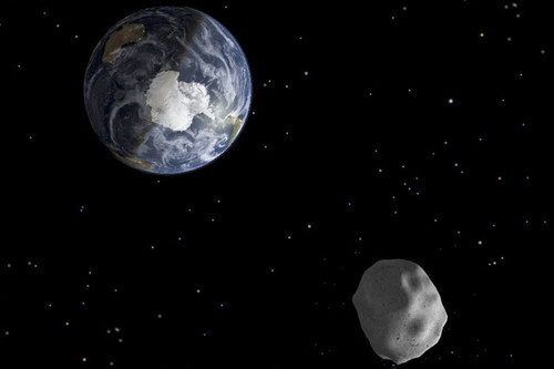 PASSING BY: A rendering shows the passage of asteroid 2012 DA14 past the Earth. Planetary experts at the National Aeronautics and Space Administration said the 150-foot-wide asteroid on Friday made the closest known approach of such a large piece of cosmic debris since space experts started tracking objects that intersect Earth’s path. (NASA/JPL-Caltech/Reuters)