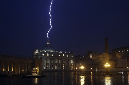 STUNNING: A bolt of lightening reached the cupola of St. Peter’s Basilica during a rainstorm at the Vatican late Monday, the same day that Pope Benedict surprised the Roman Catholic Church with his resignation announcement. (Alessandro Di Meo/ANSA/Reuters)